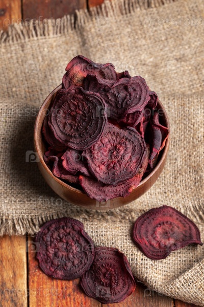 Вид сверху свекольные чипсы в деревянной миске на салфетке из мешковины на старом деревянном столе