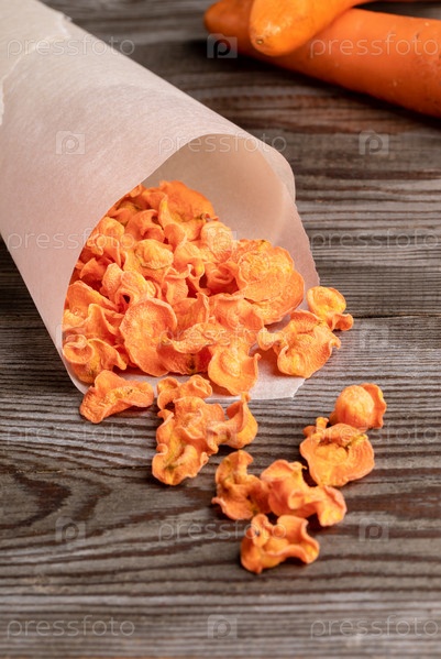 Оранжевые морковные чипсы падают из белого бумажного пакета на старый деревянный стол
