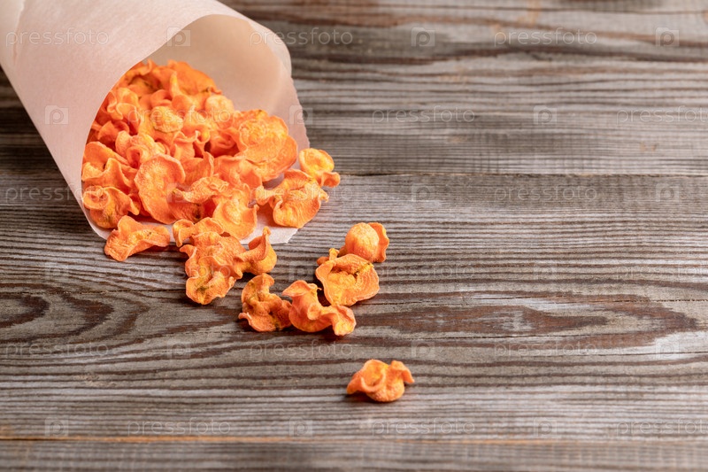 Оранжевые маленькие морковные чипсы падают из белого бумажного пакета на старый деревянный стол