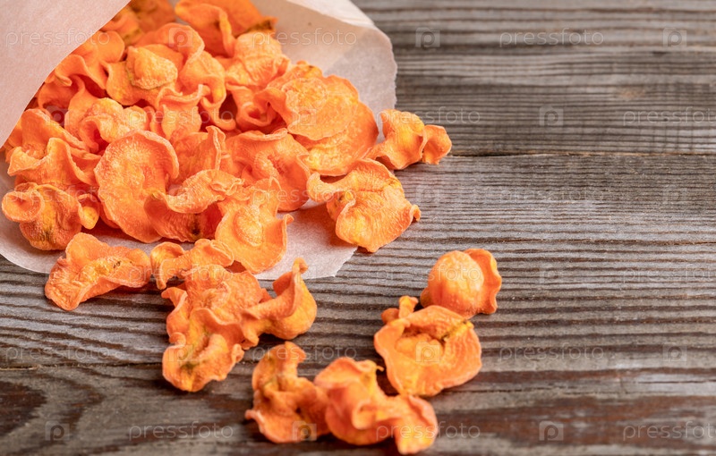 Крупным планом оранжевые здоровые морковные чипсы падают из белого бумажного пакета на старый деревянный стол