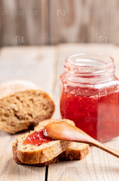 Тосты с клубничным вареньем, деревянной ложкой, стеклянной банкой варенья на деревенском деревянном столе
