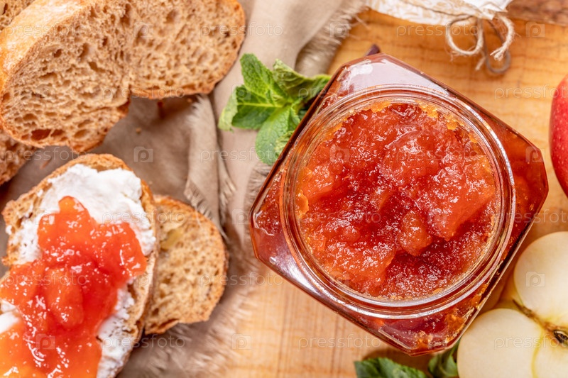 Крупный план открытой стеклянной банки, полной яблочного джема, нарезанного хлеба, намазанного творогом и яблочным джемом на деревянном столе