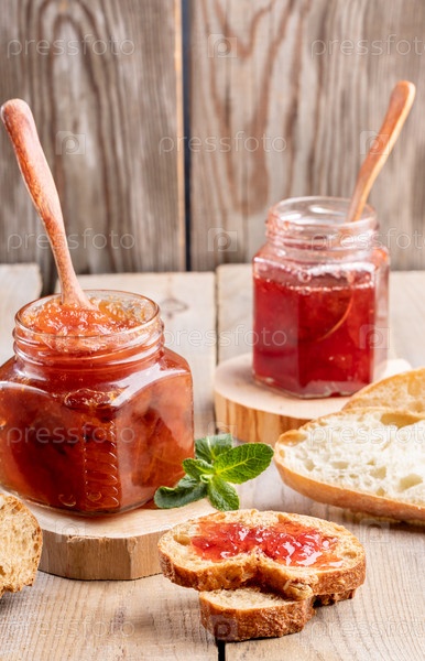 Две стеклянные банки клубничного и яблочного джема и нарезанного хлеба на деревянном фоне