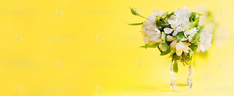 Баннер с букетом цветущих белых веток яблони на желтом фоне с копией пространства