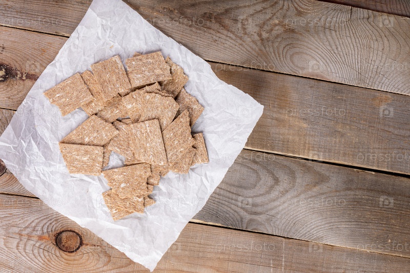 Куски кукурузных хлопьев на белой оберточной бумаге на диагональном старом деревянном фоне