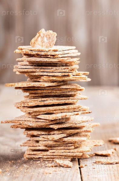Крупный вертикальный стек кукурузных хрустящих хлебцев на деревянном фоне
