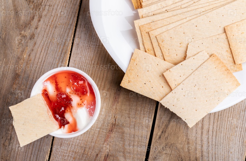 Хлебцы пшеничные на белой тарелке и в миске со сметаной и клубничным джемом на деревянном столе