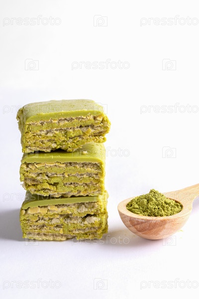 Кусочки зеленых вафель с матча, сложенные в стопку, и деревянная ложка с порошком зеленого чая матча на белом