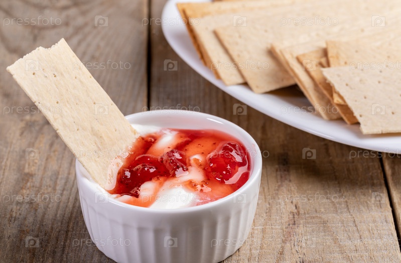 Пшеничные хлебцы крупным планом и миска со сметаной и клубничным джемом на тарелке на деревянном столе