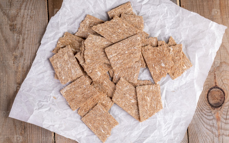 Кукурузные хрустящие хлебцы на белой оберточной бумаге на деревянном фоне