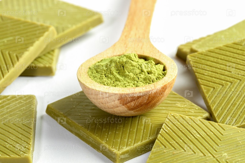 Крупным планом деревянная ложка японского порошка чая маття и набор квадратных ломтиков зеленого шоколада с маття на белом