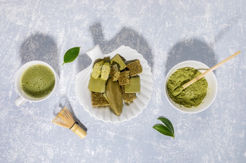 Зеленый чай матча, порошок матча, лакомства, содержащие матча, венчик и листья на светло-сером фоне с тенями