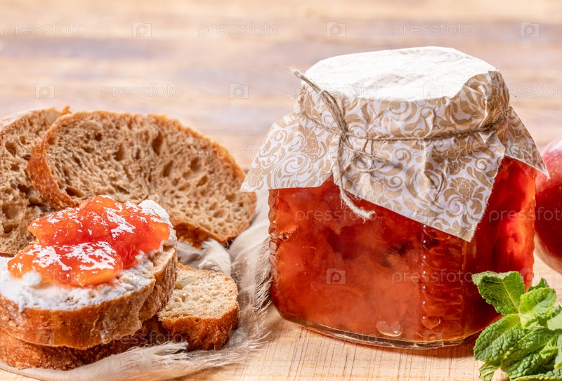 Стеклянная банка крупным планом, полная яблочного варенья, нарезанный хлеб, намазанный творогом и яблочным вареньем на деревянном фоне