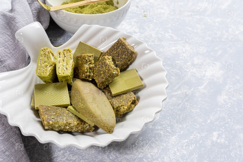 Закройте тарелку в виде ракушки с угощениями, содержащими маття, миску с порошком матча, салфетку на светло-сером фоне