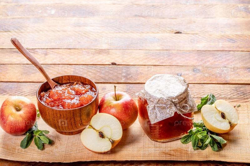 Деревянная миска и стеклянная банка с яблочным джемом и яблоками и зеленой мятой на деревянной доске на старом деревянном столе