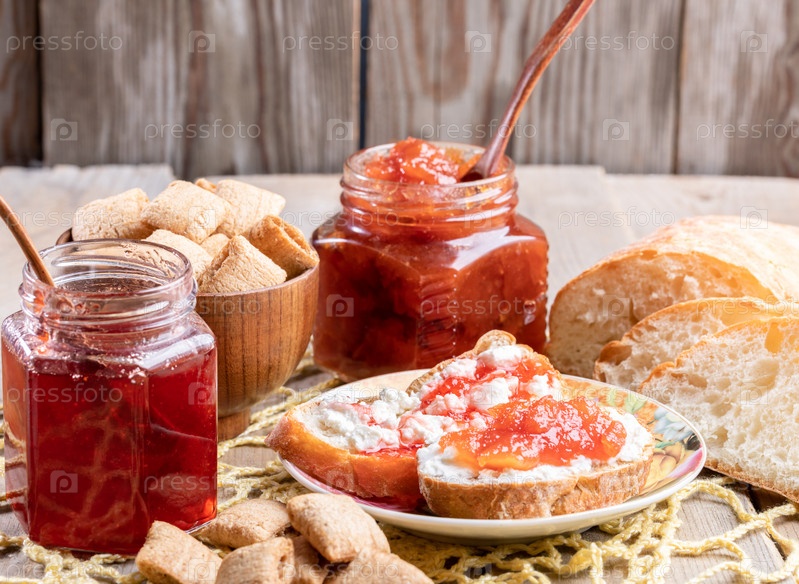 Тосты и банка с клубничным и яблочным джемом, квадратные закуски на желтой вязаной салфетке на деревенском деревянном столе