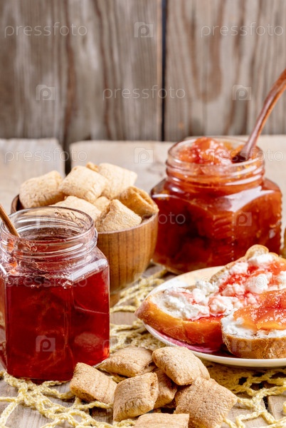 Стол для завтрака с тостами с творогом и сладким клубничным и яблочным джемом и закусками из квадратной пшеницы