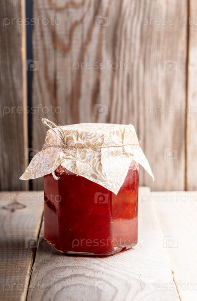 Закрытая стеклянная банка домашнего клубничного варенья стоит на деревянном столе