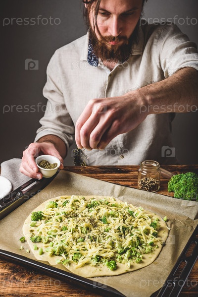 Мужчина готовит пиццу с брокколи и соусом песто