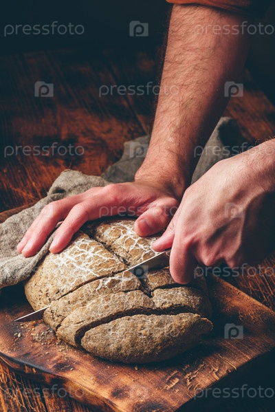 Бейкер нарезает буханку домашнего ржаного хлеба