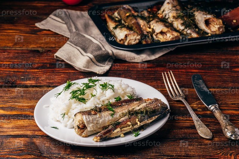 Запеченные тушки хека с рисом