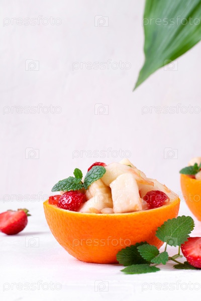 Фруктовый салат подается в апельсиновой половинке. Апельсин, груша, яблоко, банан, клубника, кедровый орех и мята нарезаны и смешаны в органической миске