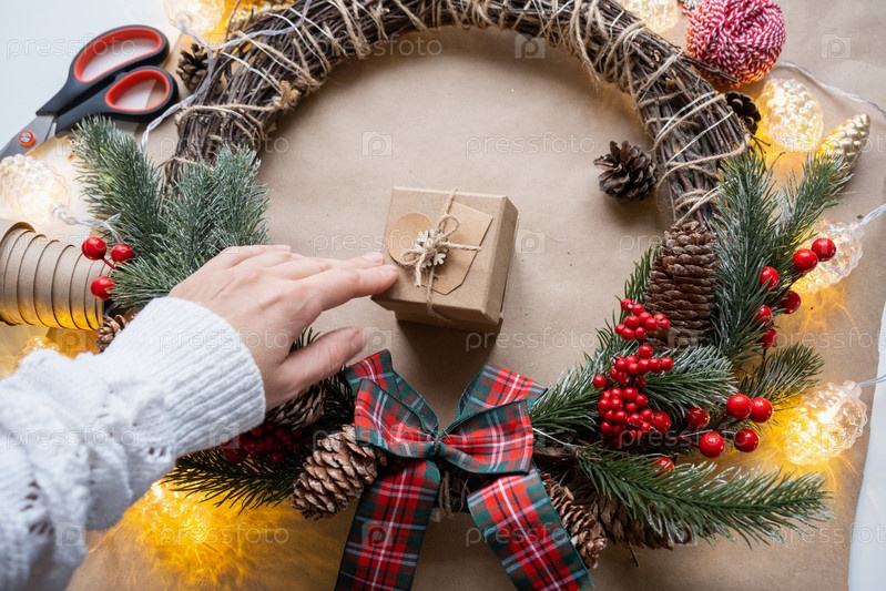 Упакуйте подарок к Рождеству и Новому году в крафт-бумагу, конусы, скотч, ножницы. Теги с макетом, натуральный декор, ручная работа, сделай сам. Праздничное настроение. Флэтлей, фон