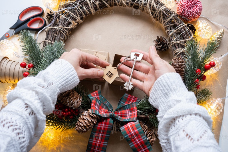 Ключ от дома с брелоком на уютном доме в подарочной коробке с упаковкой рождественского декора. Упаковать подарок на Новый год, Рождество. Строительство, проект, переезд в новый дом, ипотека, аренда, покупка недвижимости