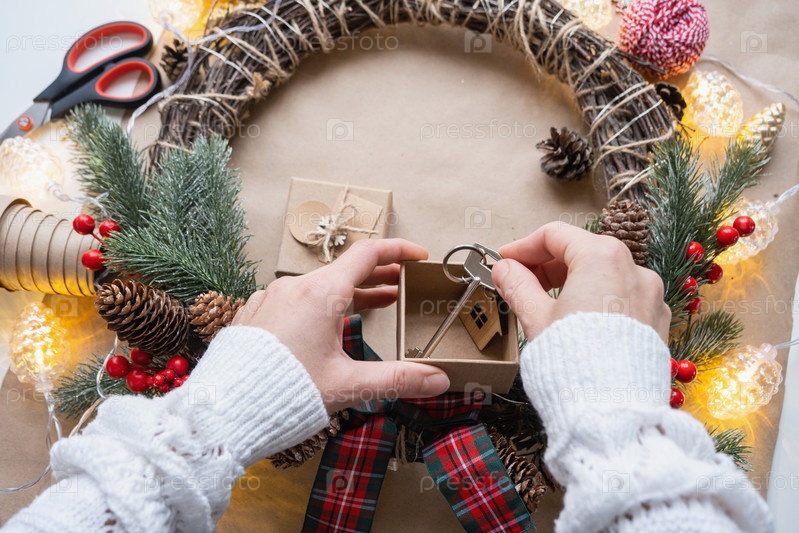 Ключ от дома с брелоком на уютном доме в подарочной коробке с упаковкой рождественского декора. Упаковать подарок на Новый год, Рождество. Строительство, проект, переезд в новый дом, ипотека, аренда, покупка недвижимости