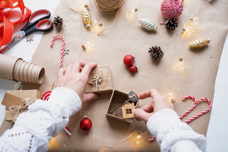 Ключ от дома с брелоком на уютном доме в подарочной коробке с упаковкой рождественского декора. Упаковать подарок на Новый год, Рождество. Строительство, проект, переезд в новый дом, ипотека, аренда, покупка недвижимости