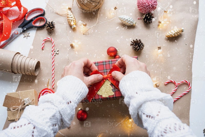 Упакуйте подарок к Рождеству и Новому году в крафт-бумагу, конусы, скотч, ножницы. Теги с макетом, натуральный декор, ручная работа, сделай сам. Праздничное настроение. Флэтлей, фон