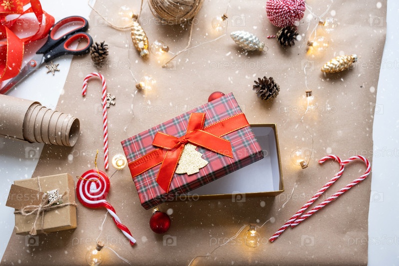Упакуйте подарок к Рождеству и Новому году в крафт-бумагу, конусы, скотч, ножницы. Теги с макетом, натуральный декор, ручная работа, сделай сам. Праздничное настроение. Флэтлей, фон