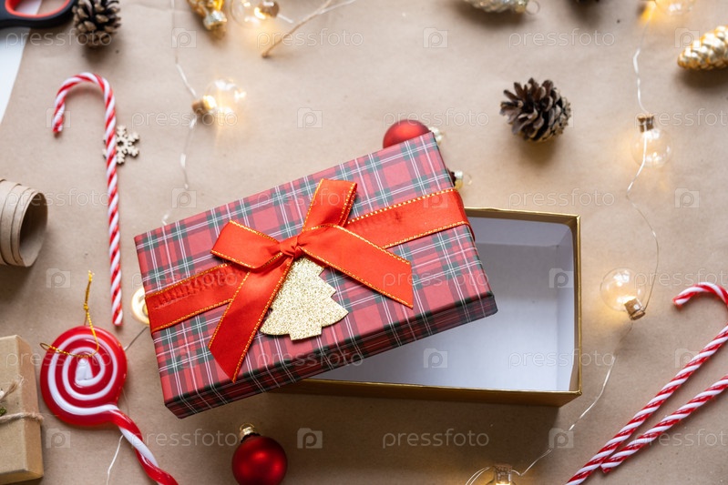 Упакуйте подарок к Рождеству и Новому году в крафт-бумагу, конусы, скотч, ножницы. Теги с макетом, натуральный декор, ручная работа, сделай сам. Праздничное настроение. Флэтлей, фон