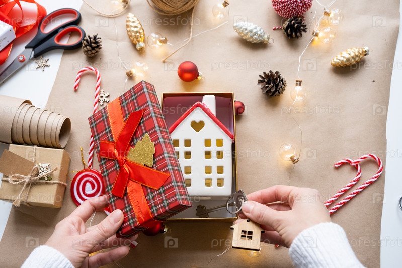 Ключ от дома с брелоком на уютном доме в подарочной коробке с упаковкой рождественского декора. Упаковать подарок на Новый год, Рождество. Строительство, проект, переезд в новый дом, ипотека, аренда, покупка недвижимости
