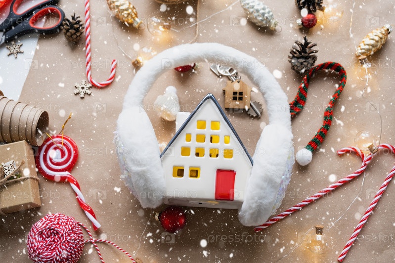 Ключ от дома с брелоком на уютном доме с рождественской раскладкой. Подарок на Новый год, Рождество. Строительство, дизайн, проект, переезд в новый дом, ипотека, аренда и покупка недвижимости