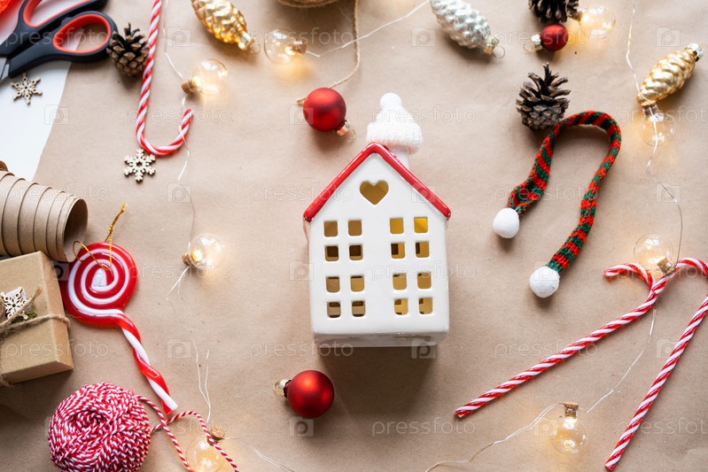 Уютный дом в рождественском декоре, теплый вязаный шарф, шапка, утепление. Зима, снег - утепление дома, защита от холода, система обогрева помещений. Праздничное настроение, Рождество, Новый год