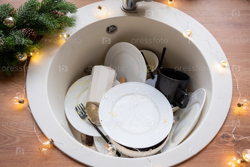 Грязная посуда в раковине на украшенной гирляндами кухне, праздник после застолья на Рождество. Беспорядок после гостей на Новый год, уборка кухни, моющие средства, клининговые услуги