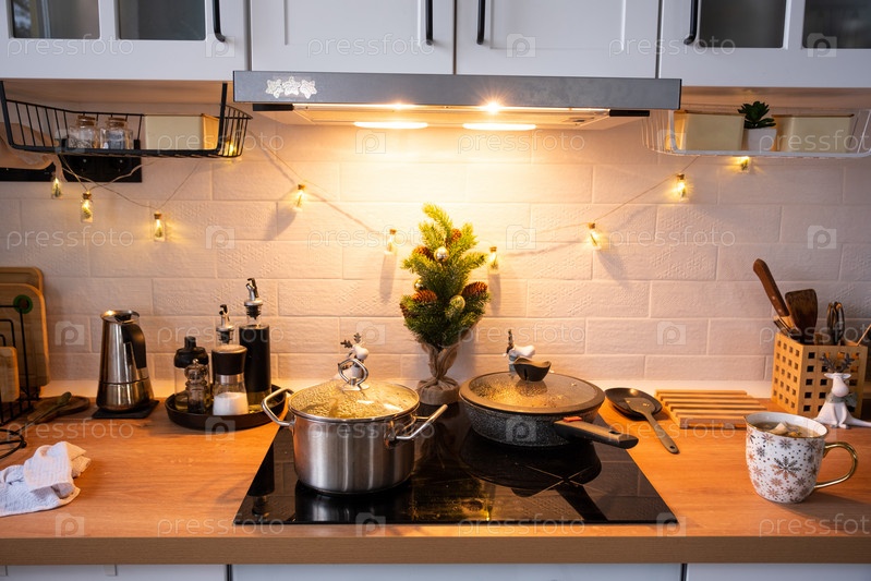 Праздничный новогодний декор и бардак на кухне, приготовление угощений к празднику. Новый год, настроение, домашний интерьер