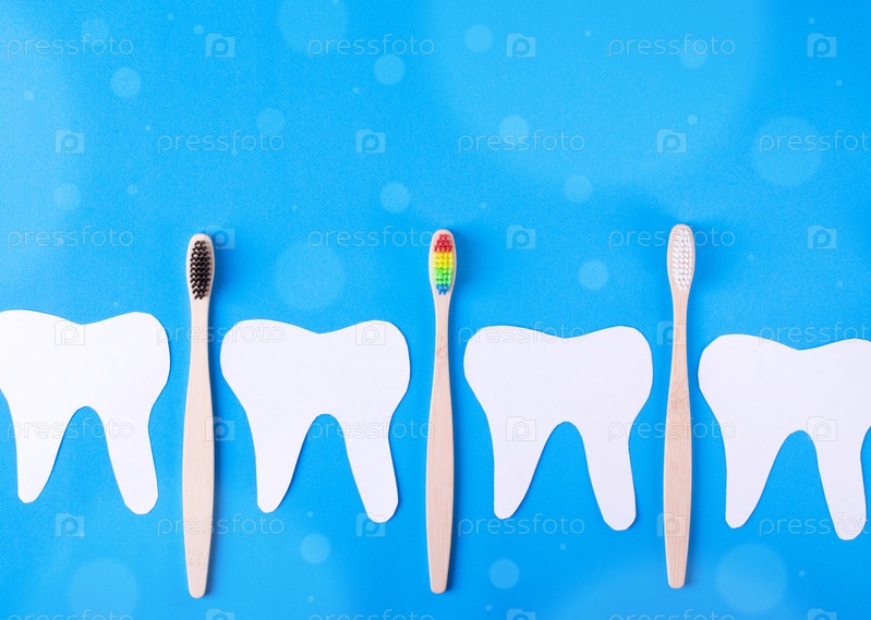 Бумажные зубы и бамбуковые зубные щетки с разноцветными щетинками на синем фоне. Стоматолог и гигиена полости рта. Гигиенический инструмент из биоразлагаемых экологически чистых материалов. Концепция детской стоматологии. Макет с копией пространства