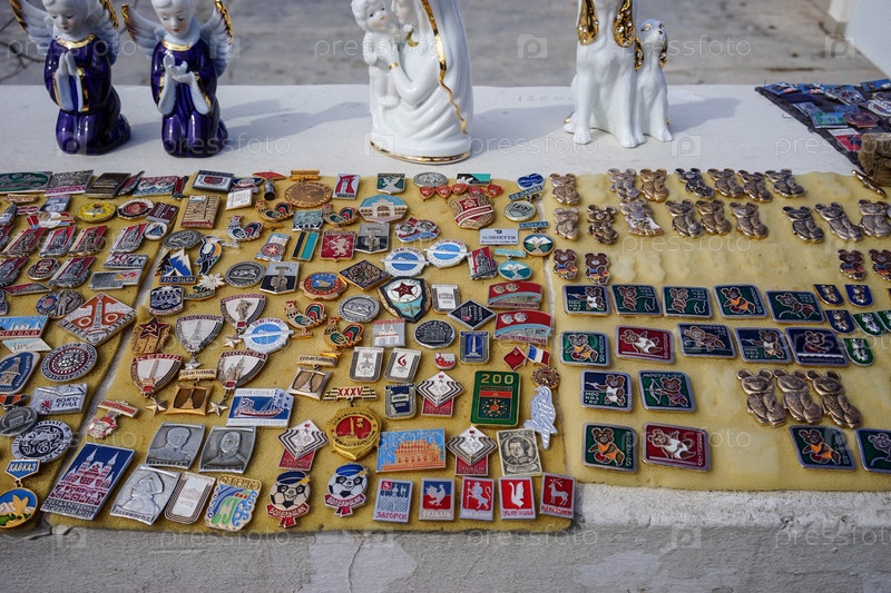 Севастополь, Крым-16 марта 2018 г.: Уличная распродажа коллекции икон и статуй разных типов