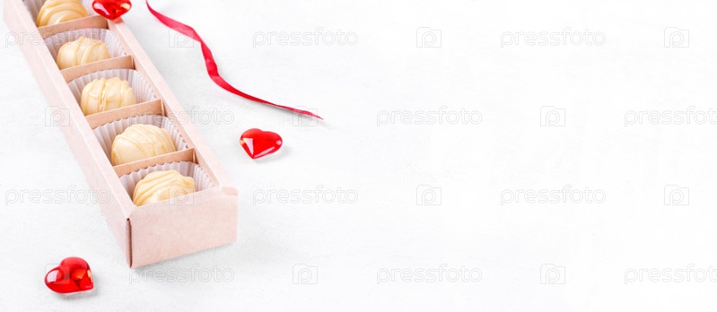 Веб-баннер с конфетами из белого шоколада в подарочной коробке и декоративными сердечками на белом столе. Десерт ко дню святого Валентина. Макет с копией пространства