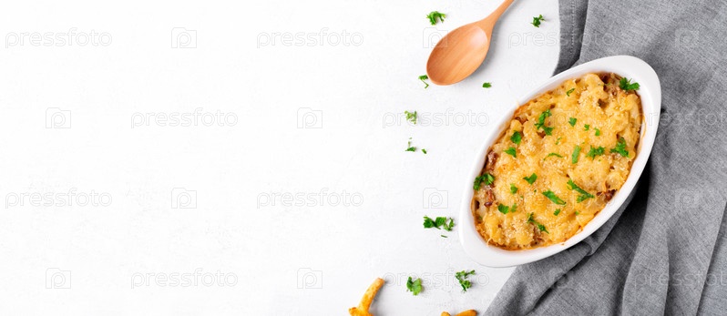 Мак и сыр с лисичками в керамической формочке на белом столе. Американская еда. Веб-баннер с копией пространства