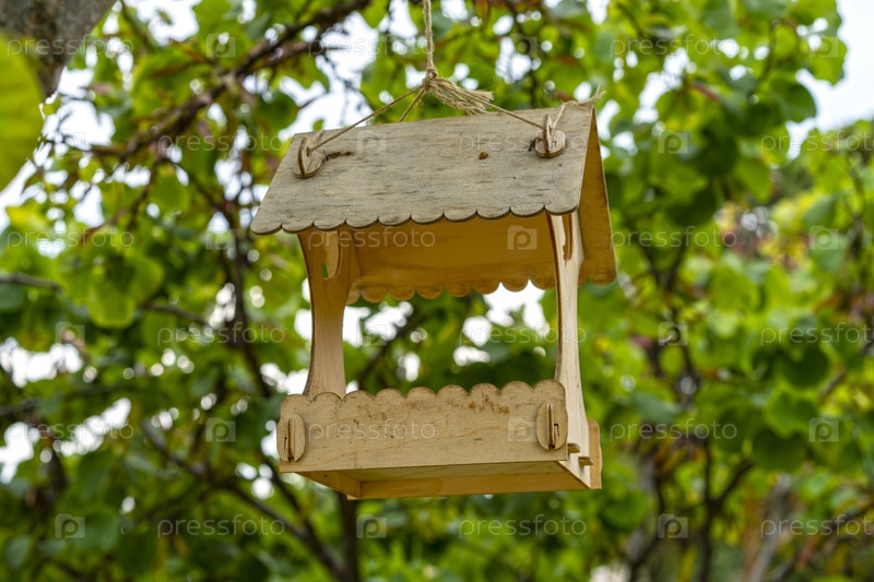 Деревянные кормушки для птиц на размытом фоне деревьев