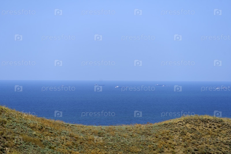 Морской пейзаж с видом на холмы с сухой травой