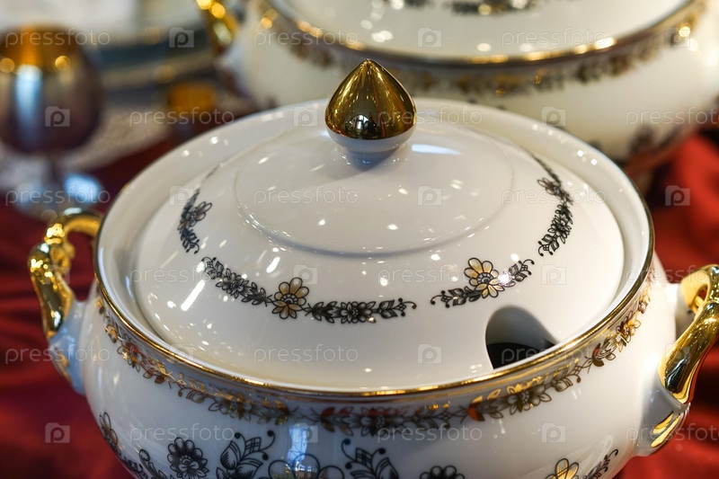 Фон с белой фарфоровой посудой с цветочным орнаментом и позолоченными деталями