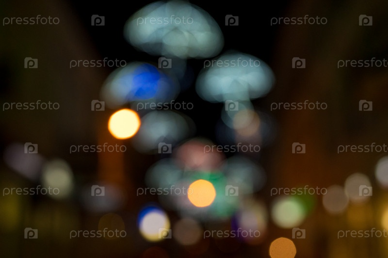 Размытый фон города ночью с яркими светящимися силуэтами зонтиков