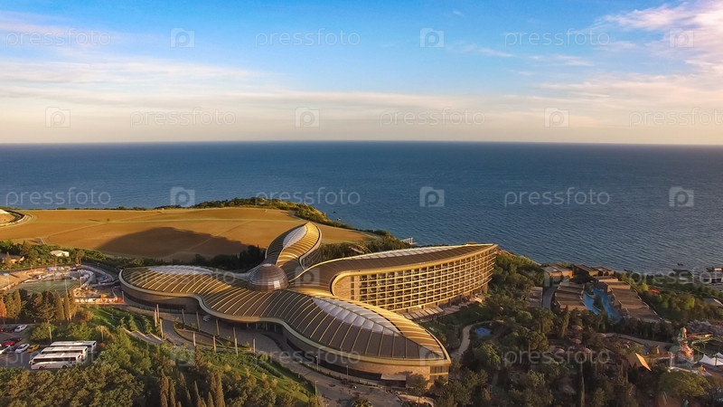 Вид с воздуха на современный курорт в виде цветка лотоса на пляже