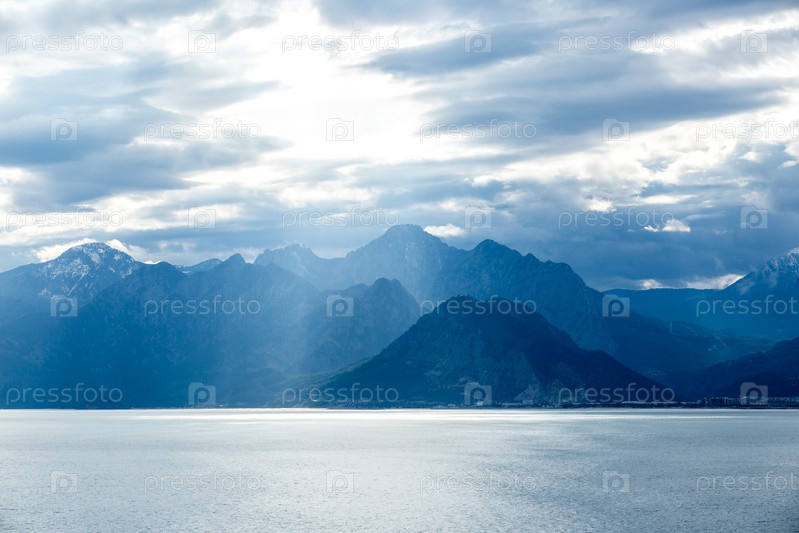 Живописный вид на знаменитый турецкий пляж Коньяалты на закате. Солнечные лучи пробиваются сквозь облака и освещают горы. Анталия, Турция