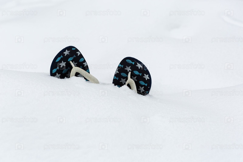 Шлепанцы в белом пушистом снегу. Мечты о летних каникулах. Концепция летнего отдыха на море для туристических агентств