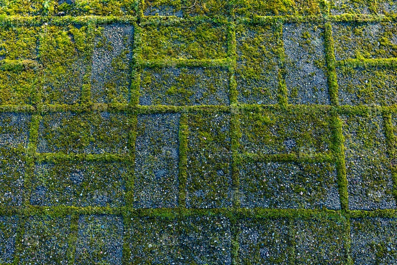 Каменистый грубый текстурированный фон. Зеленый мох на каменной тропинке, крупным планом